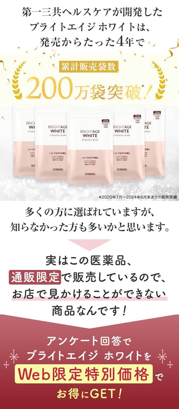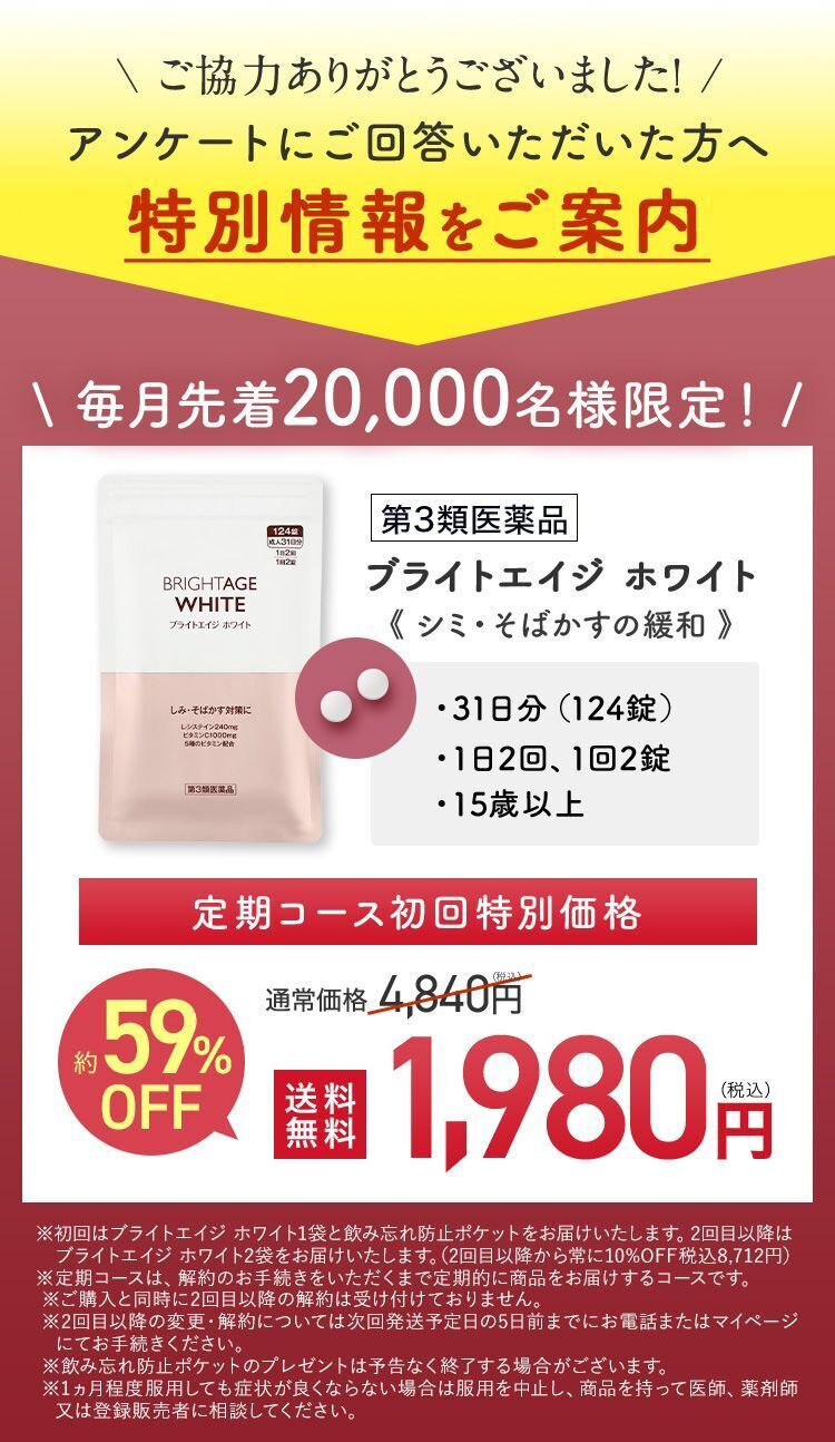 初回はブライトエイジ ホワイト1袋と飲み忘れ防止ポケットをご注文から1週間程度でお届けいたします。2回目はブライトエイジ ホワイト2袋を初回発送日から約30日後、3回目以降はブライトエイジ ホワイト2袋を前回発送日を基準に約60日ごとにお届けいたします 。